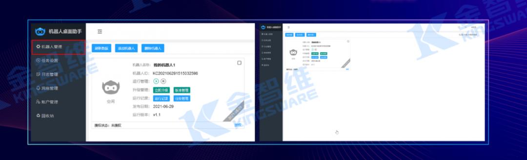 业务用户通过桌面助手操控多个单机机器人,操作管理集中、交互清晰简洁、使用方便快捷。
