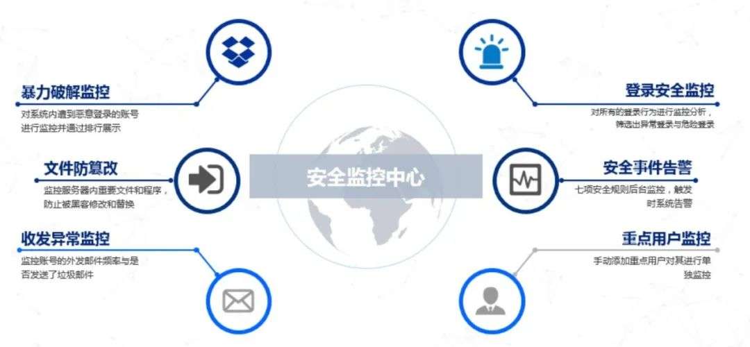 1.主监控面板提供多维度的实时行为预警。2.提供账号安全、系统安全的监控防护。3.监控可疑邮件,支持针对邮件类别、发送账号统计监控、可疑邮件状态查看。