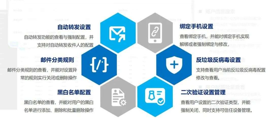1.用户行为审计:更细致的用户行为分类、更详细的行为记录、一键导出查询结果等。2.邮件审计:高效查询邮件收发记录、直击发信源与最终收件人、批量敏感词邮件审计、便捷删除不合规邮件等。