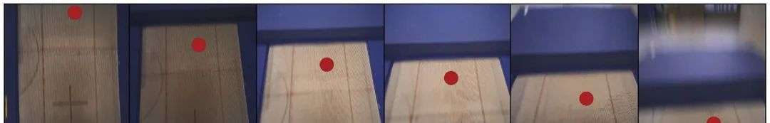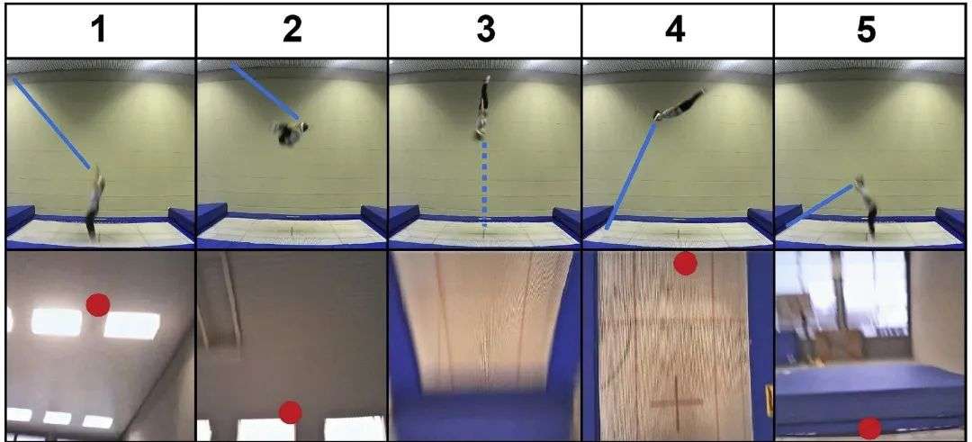 1-5依次是从起跳到落回的过程,上排为侧方摄像机记录图像(蓝线表示视线方向),下排为选手前额摄像机记录图像(红点表示注视位置)丨参考文献[1]