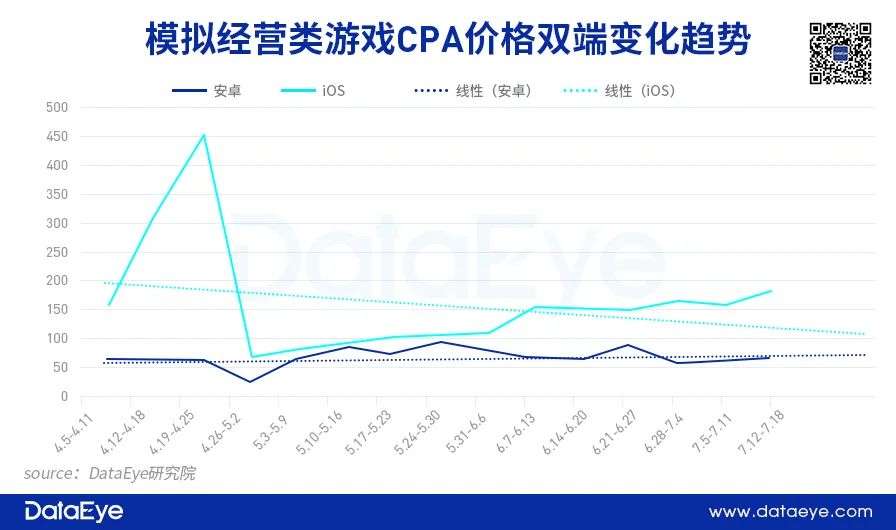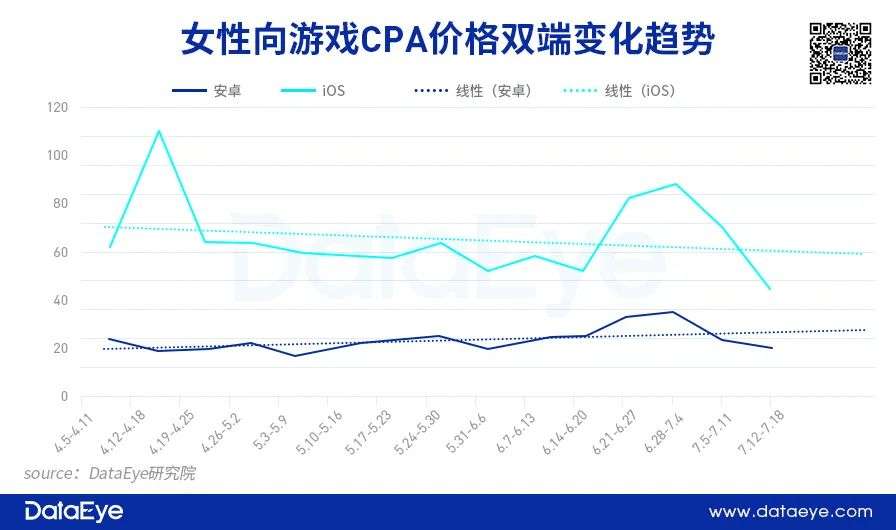 模拟经营类游戏进入四月以来,ios端的CPA价格一再降低,最低峰时为63.29元,而女性向游戏在4月初ios端CPA价格出现一个小高峰,此后也继续下降,6月中下旬至7月初有所回升,但从线性预测曲线走向看,ios端的价格依旧在下降。