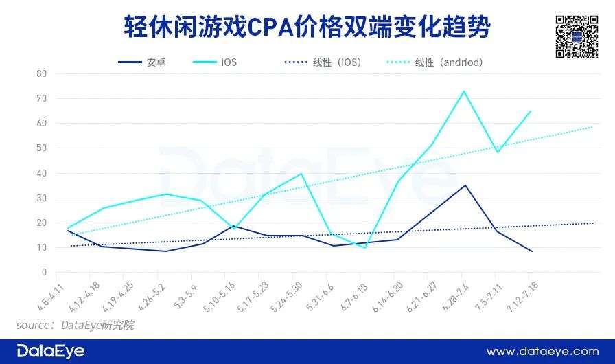同样地,轻度休闲类游戏双端CPA价格波动幅度也日趋增大,尤其是在ios端呈现出曲折上升的表现,但整体价格相较于卡牌类偏低,最高峰值为72.62元。