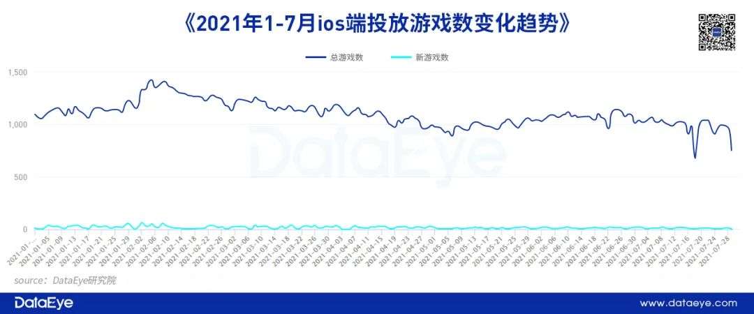 但广告主们对于ios端的广告投放策略确实有所收紧,今年的游戏投放市场渐渐趋于往年常规发展走向,进入暑期投放旺季,ios端投放素材数变化仍然十分保守。