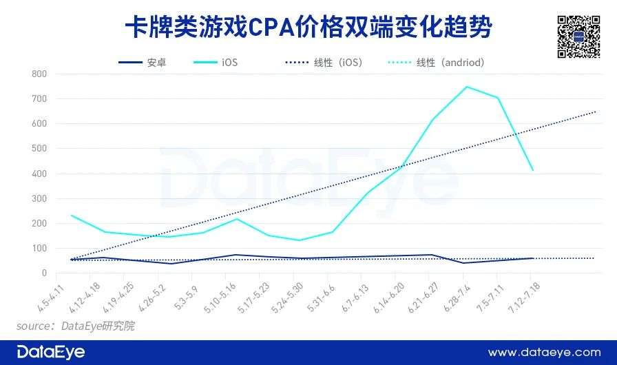 而一贯作为头部投放品类的卡牌和轻休闲类游戏,即便面对IDFA隐私新政的限制,也依然需要通过投放一定比例的效果广告来为产品引流,仍然需要参与到激烈的广告投放竞争中,加之暑期不断有储备新品上线,ios端的CPA价格在一定时间段内也会持续升高。