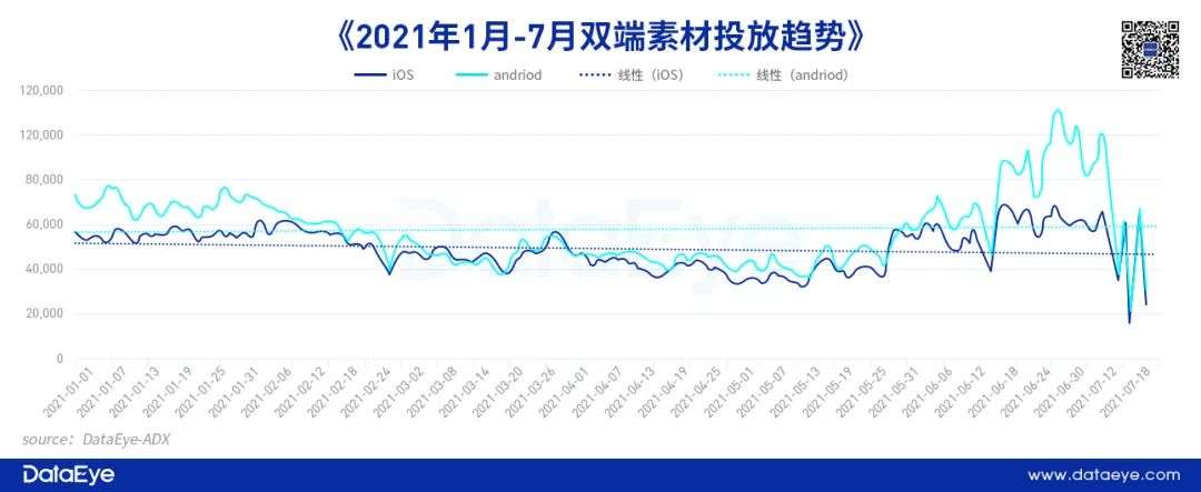 4月27日-7月27日,ios端的素材投放量相较于前三个月减少了约34,970组,对比去年同一时段ios端周期投放情况,已呈现下滑态势。