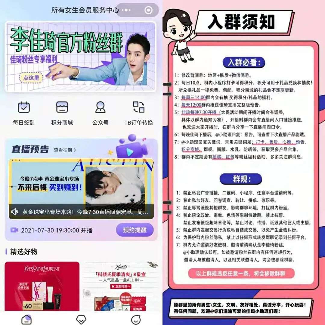 经新腕儿进一步观察,李佳琦社群内主要以分享直播预告,抽取福利和优惠券为主,另外李佳琦团队还开发了一款名为所有女生会员服务中心的小程序,功能包括签到、积分商城、公众号内容链接以及TB订单转换。