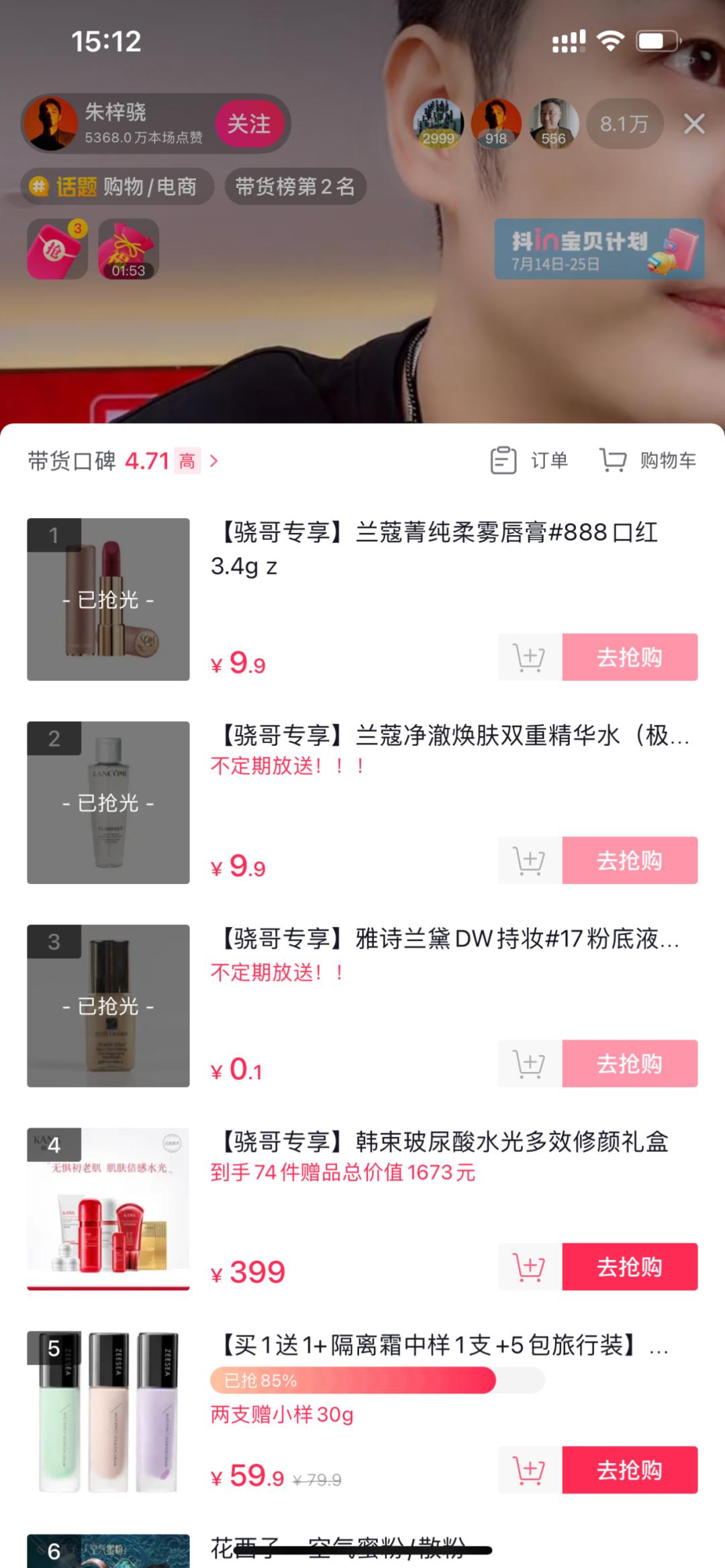 为了冲人气,在朱梓骁的直播间里,“抽奖送口红”、“9.9元的兰蔻888秒抢”等优惠套路,频繁出现。