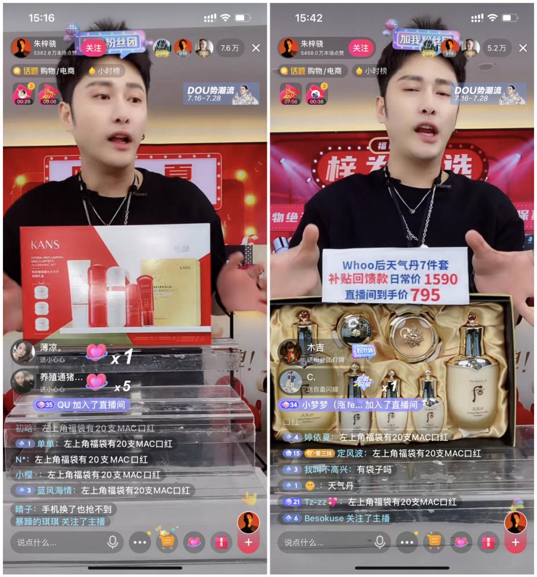 每当直播间人数达到一个巅峰时,朱梓骁会暂时将福袋低价产品放到一边,迅速开始推销像韩束、Whoo后这样单价超过300元、500元的产品,进行几分钟带货之后,再转回低价福利商品。