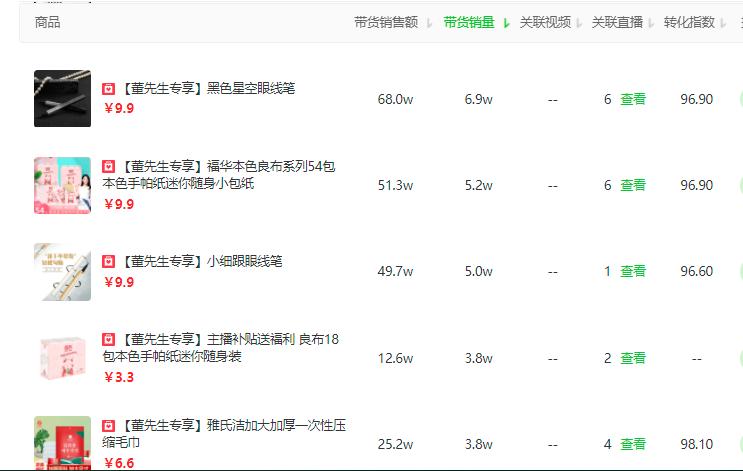 根据飞瓜数据专业版显示,在董先生珠宝直播间内的带货商品中,销量最高的产品全部都是低于10元的特价产品,像9.9元的眼线眉笔,6.6元的压缩毛巾,3.3元的纸巾等等,由于单价低廉,转化率全部高达97%以上。