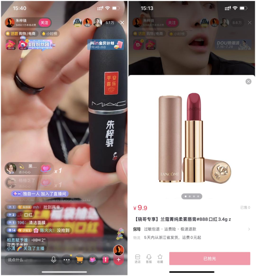 像印有朱梓骁名字的mac口红,只要网友在直播间发送口令“左上角福袋有20支MAC口红”,就有机会收到福袋,而且是包邮免费送出;还有9.9元一支的兰蔻888,朱梓骁在直播间反复强调,“只有20支!抢到就是赚到!”直播间人数也顺利升到9.1万。