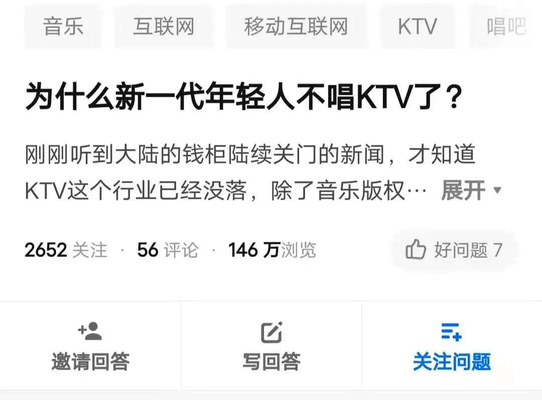 知乎上也有人提问“为什么新一代年轻人不唱KTV了?”该问题吸引了500多个回答,被浏览了146万次。回答者有从业者,但更多是年轻人的现身说法。尽管这些回答面向不同,但都可以归结为一点:新一代年轻人的娱乐选择太多了。