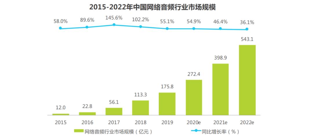 用户规模的增长带动了网络音频市场规模的快速增长,2019年中国网络音频行业市场规模为175.8亿元,同比增长55.1%,预计在2022年市场规模将达到543.1亿元。