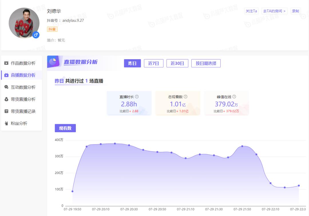 昨晚的直播无疑接住了网友们的期待,根据小葫芦网站的数据显示,该场直播同时在线人数最高峰时达到379.02万,2.88小时的总观看数触达破纪录的1.01亿,并助力刘德华官抖号一夜涨粉426.5w。