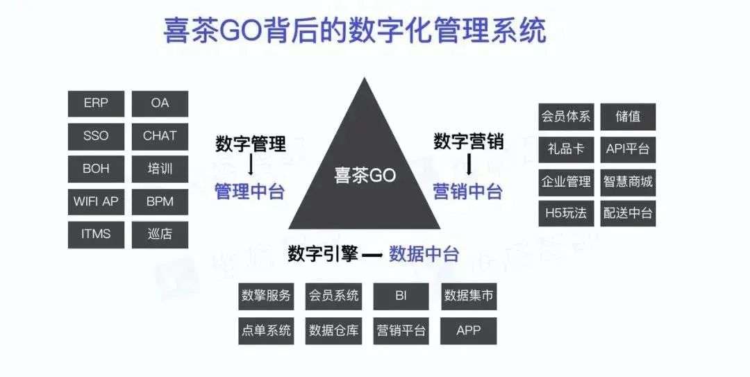 完成数字化后,喜茶又向前迈了一步,即信息化。公司内部将各类割裂的系统进行串联,包括人力资源系统、供应链系统、BI系统等等。最后,团队发现公司内部仍旧漂浮着各种各样相互孤立的系统,为此又搭建了大数据的中台部门,将其进行搜集和归档。