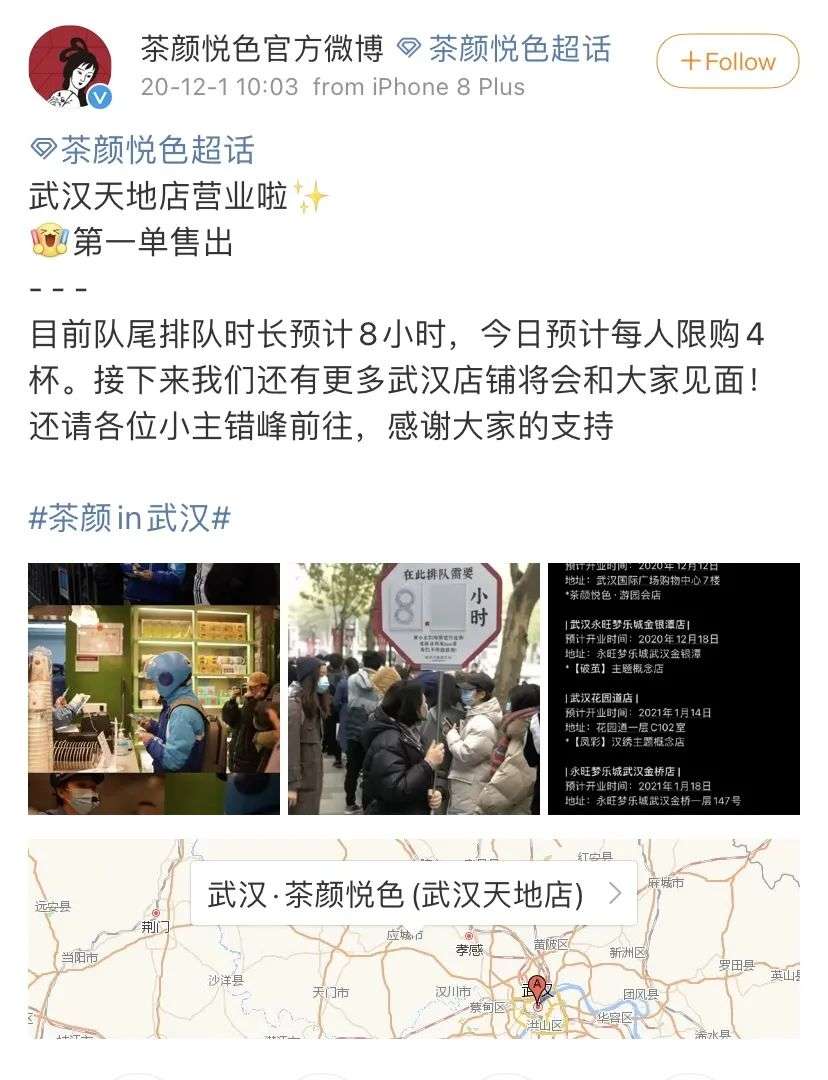 “只有在长沙才能喝到茶颜悦色”成为消费者间的共识,对本地消费者而言是品牌认同感和区域文化自豪感,对游客而言则是对产品的好奇心和打卡的决心。据茶颜悦色官方微博数据统计,武汉首店营业当日,排队时长超过8小时,一度登上热搜。网友戏称“在武汉的你现在坐一趟高铁去长沙喝杯茶颜悦色吃顿一盏灯再回来的时间应该比去武汉天地排队的时间要短。”