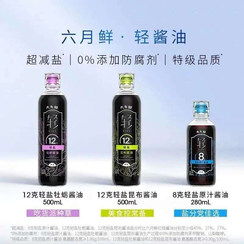 在这种情况下,降低盐中的钠含量同时增加鲜味就成了所有降盐食品品牌的课题。做减盐酱油的六月鲜也表示「低盐并不难,难的是如何做到减盐不减风味。」针对这个问题,六月鲜轻盐酱油的解决方案是通过海藻、牡蛎等天然食材,在减盐的同时,满足味蕾对咸度和鲜度的要求。