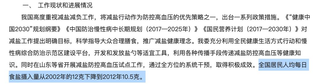 中国的饮食习惯则大大超过了这一标准,卫健委的官方数据停留在 2012 年中国居民人均食盐摄入 10.5g 上,而在 2002 年,这个数据还是 12g。