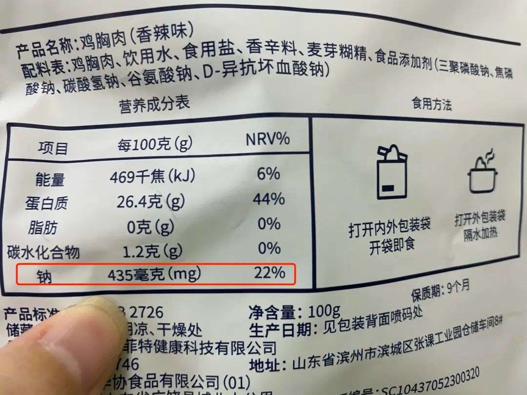 办公室找到的鸡胸肉零食钠含量 435mg/100g,钠含量不低