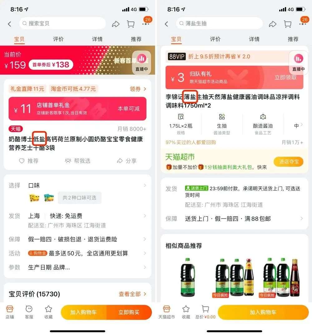 在电商平台,能用上这个词做介绍的产品就多了不少。饼干、酱油、食盐、火腿肠都在此列,由于产品本身的特殊性,这些产品很难达到低盐标准,减盐就是它们交出的成绩单。