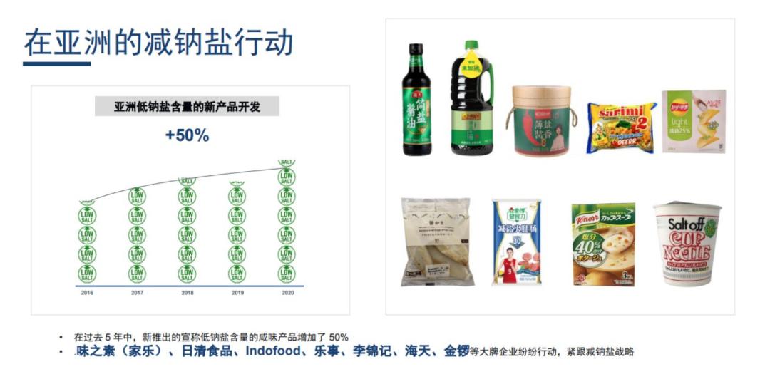 同时,减盐的目标也不是一个食品品类和品牌可以实现的,因为消费者的习惯很难改变。在减盐的过程中,经常出现的一种情况是消费者使用了减盐产品,但他的身体觉得自己需要更多的钠、更多的盐,因此他们就会使用比平常更多的减盐产品,这就会让产品的减盐变得无效。