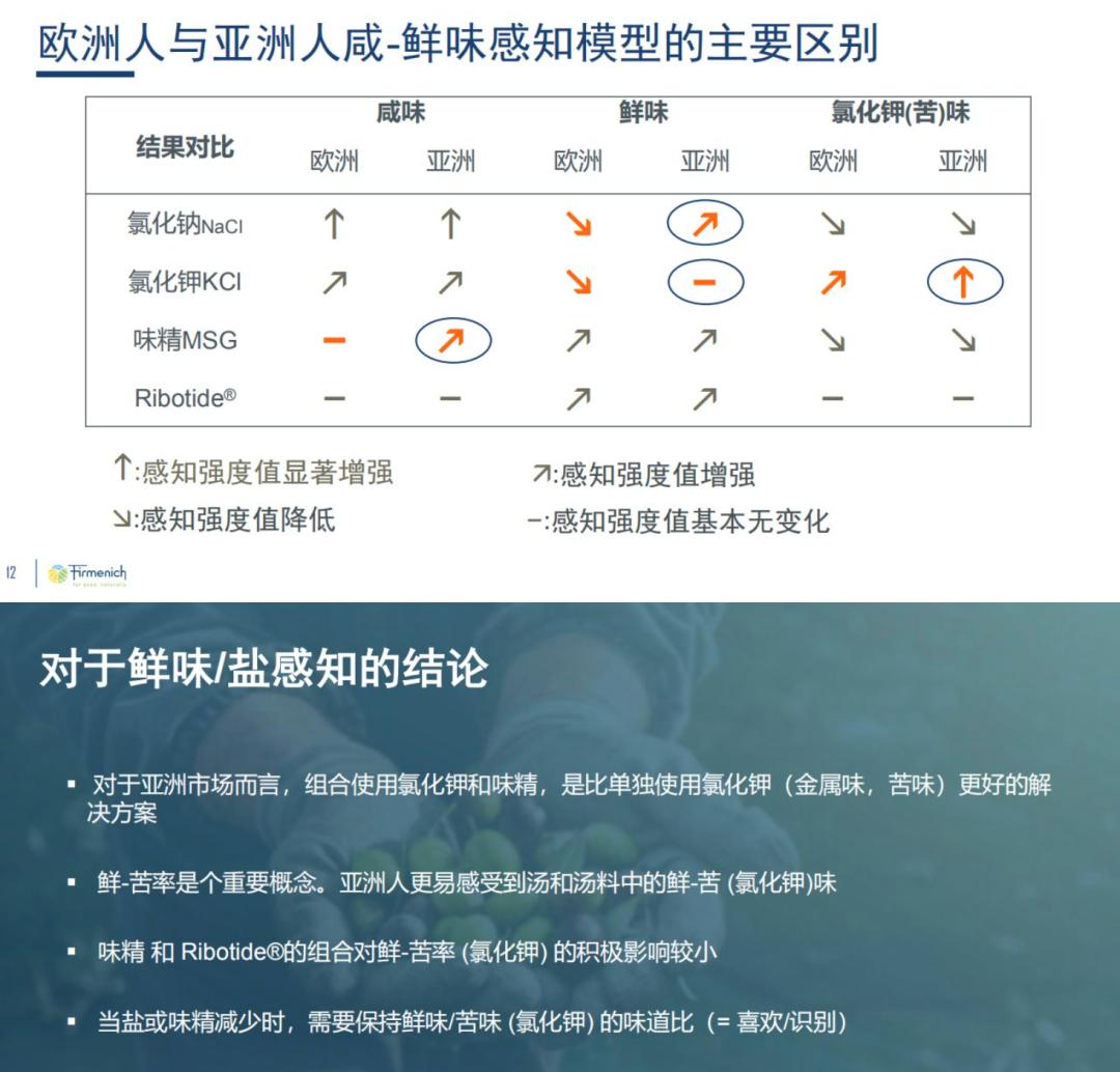 芬美意曾针对亚洲人和欧洲人的咸、鲜、苦味感知模型进行过调研。调研发现亚洲人对氯化钠(钠盐主要成分)的鲜味评价较高,大家会把钠盐和鲜味联系起来。但同时亚洲人对氯化钾(钾盐主要成分)的苦味也特别敏感,对这种味道较为抗拒。