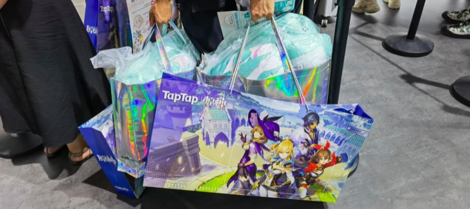 这次,游戏发行平台TapTap也很火,很多年轻人手里都提着两个大袋子,一个是B站的会员购,一个是TapTap与《原神》游戏的联名款。TapTap与《原神》游戏的联名活动,也是Cj为数不多的有排队现象的展台。