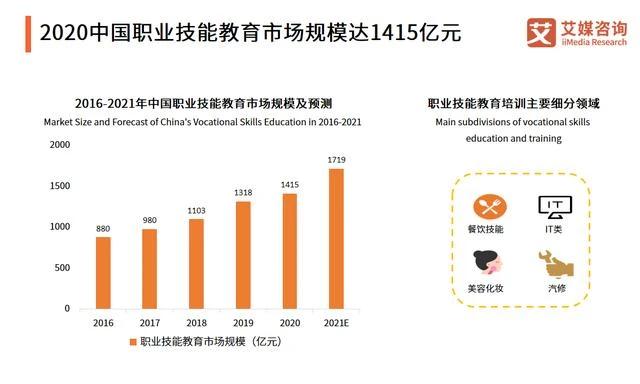 在2019年至2020年的教培行业大爆发中,职业教育行业收益颇多,据艾媒咨询数据,2020年中国职业技能教育试产规模达到了1415亿元,并预计2021年市场规模有望扩大至1719亿元。
