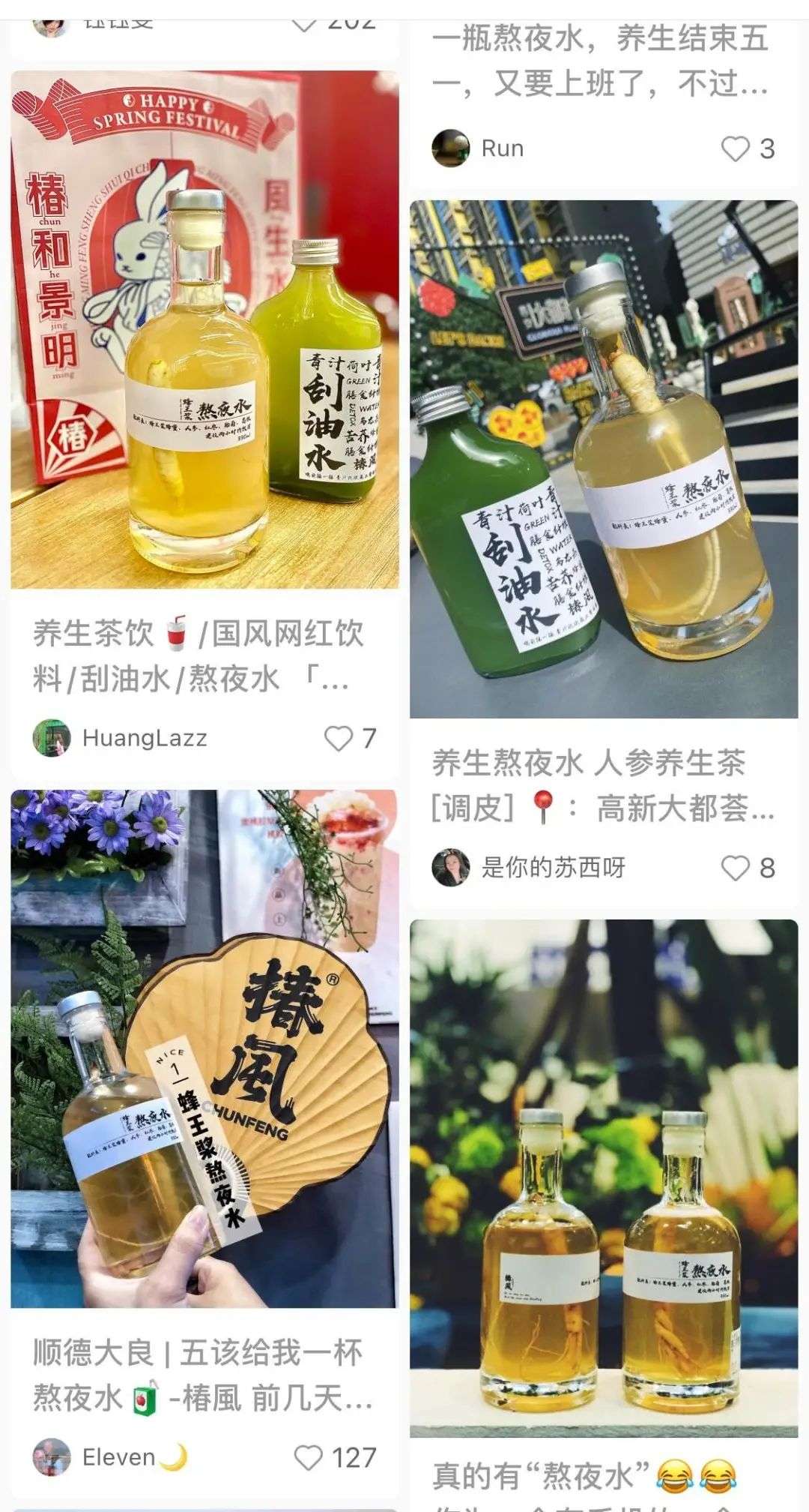 据开菠萝财经不完全统计,目前,“椿风”“荷田水铺”“若遇江南”“炖物24章”“花梨元气研究所”等新式茶饮品牌已推出包括“蜂王浆熬夜水”在内的各类养生饮品。传统老字号“同仁堂” “张仲景”“童涵春堂”以及凉茶品牌“王老吉”也纷纷推出了“熬夜水”等草本茶饮。