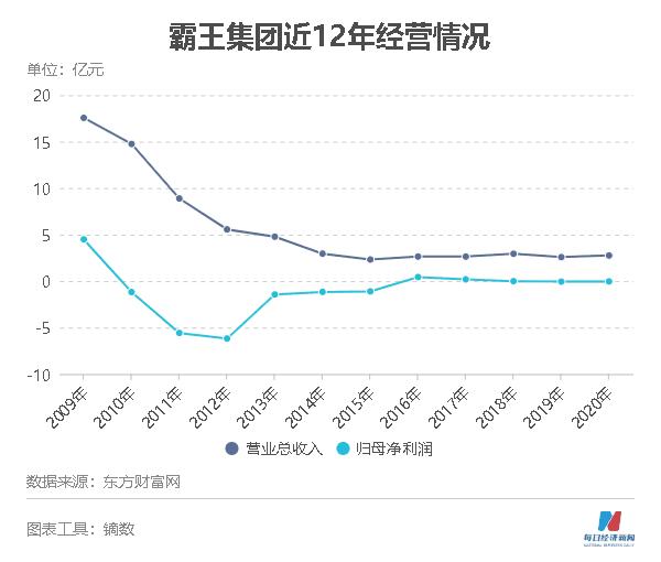 记者查询发现,霸王集团在2009年创下17.56亿元的营业额,自2014年开始已经缩水至3亿元以内。近十年来的归母净利润更是只有 2016年及2017年取得正数,其余年份均是亏损状态。2020年,霸王集团营收及净利润分别是2.76亿元及亏损403.80万元。