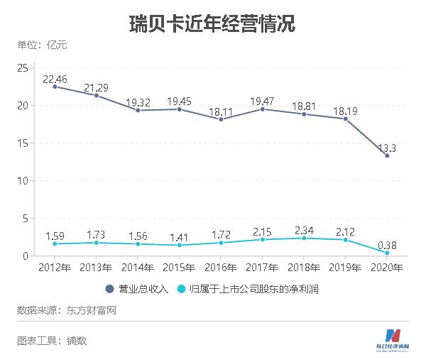 瑞贝卡(600439,SH)将假发销往北美、非洲、欧洲以及亚洲等地区,是国内假发龙头企业,自2014年开始,其营收规模由22亿元左右跌至20亿元以内,近4年更是遭遇连续下滑,2020年收获13.3亿元,净利润也连续3年下滑,去年仅盈利3814万元。