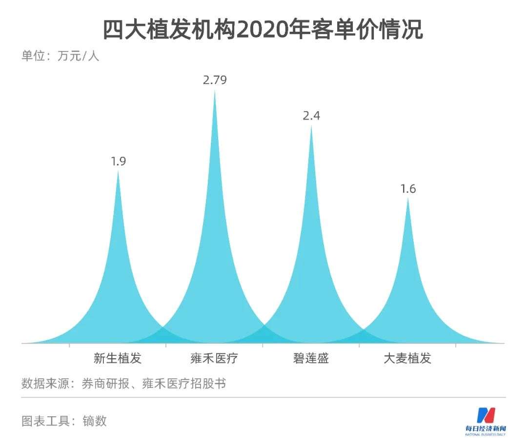 记者结合海通证券、开源证券研报发现,目前全国性的连锁植发机构还包括新生植发、碧莲盛、大麦植发,这3家在2020年取得的营收分别是4.85亿元、7.1亿元及6亿元,服务的植发患者数分别是2.5万人、3万人及3.7万人,计算可知客单价分别是1.9万元、2.4万元以及1.6万元。因此雍禾医疗较这些机构的收费要高出不少。