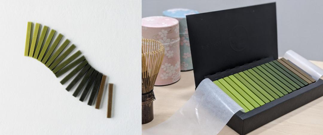 当然还有其他的玩法。以日本品牌Nanaya推出的Matcha 7抹茶巧克力为例,它用颜色的梯度,表现了抹茶的不同浓度。此外,也有用不同的红色表示辣度、用不同的黄色表示甜度等操作。