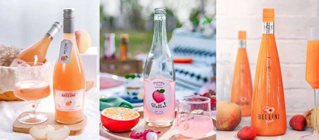 比如欧洲各大品牌的BELLINI桃味气泡酒,各个品牌都采用不同的粉色色系,有些是白偏粉、有些是比较纯正的粉色、有些是粉偏橘。