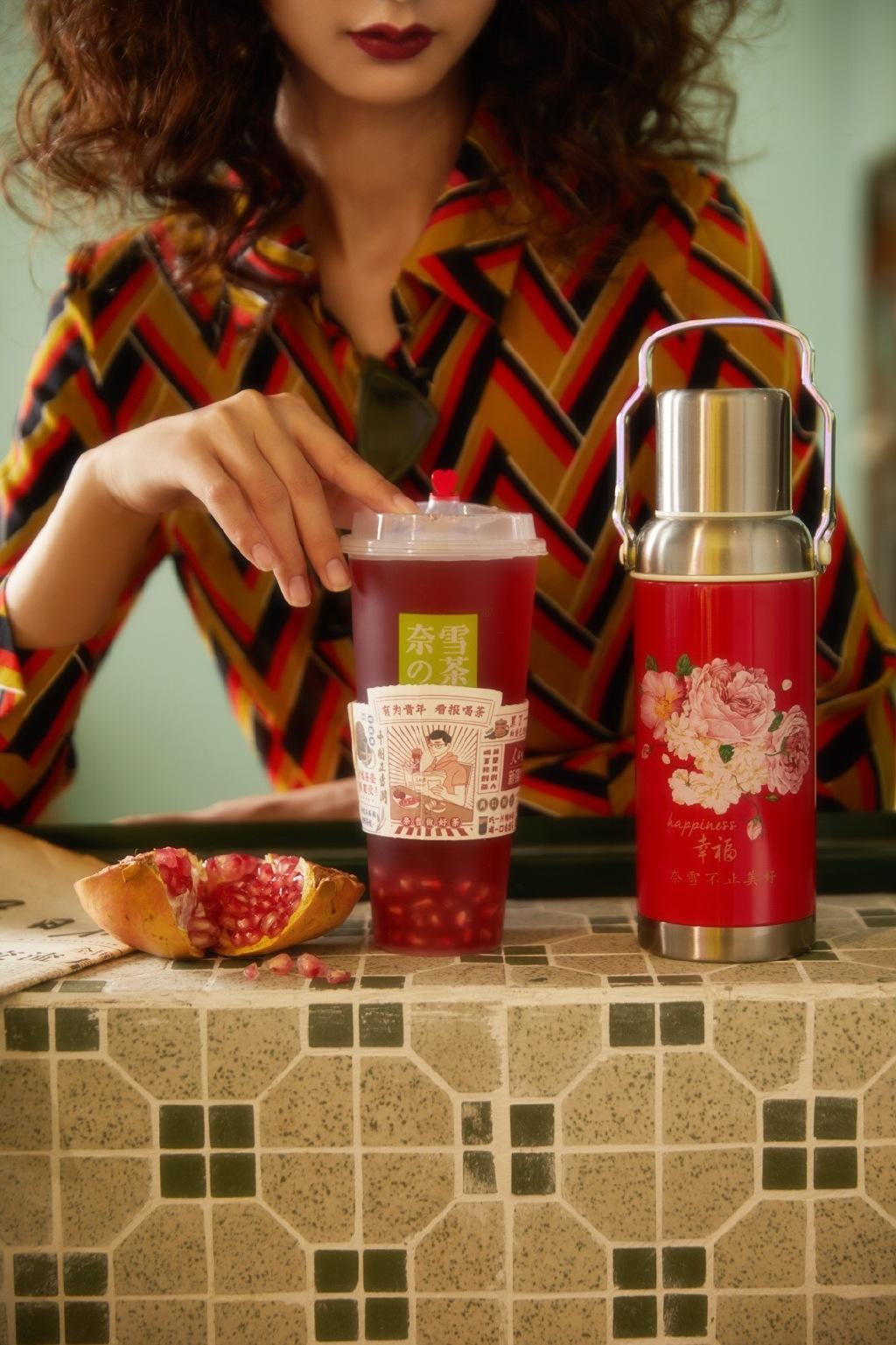 比如,2019年,奈雪的茶和人民日报新媒体联名推出「报款」红石榴,红石榴口味,用暗红着色。