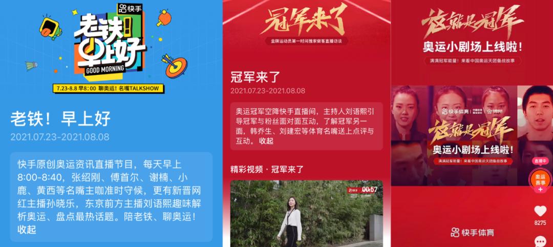 《冠军来了》对标的无疑是《王牌登陆》等访谈类节目,它同样邀请奥运冠军在快手直播间与大家见面,讲述奥运幕后的新鲜故事,用游戏开启奥运互动时间。同时,韩乔生、刘建宏和房学峰等体育名嘴坐镇后方,奉上精彩的观点和评论。