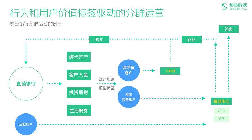 这是直销银行的分群运营的案例。通过绑卡开户、客户入金、投资理财、生活缴费的行为进行分群管理,包括高净值客户群体、预警流失用户群体。接下来可对这两部分群体进行精细化运营,将高净值客户群体推送至 CRM,做召回或者刺激购买的推送;推送中心则可对流失预警用户进行召回,避免流失。