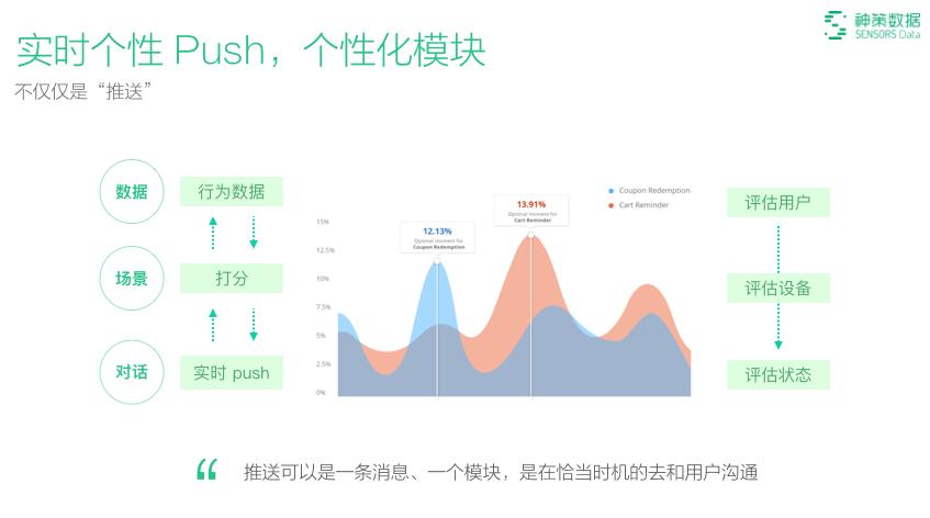 在做 push的过程中,我们思考如何将push变得更为高效,转化率更高? 如图,一家以色列公司尝试采集用户行为过程中的一些行为数据,根据当前的场景、状态、设备类型等进行打分。举个例子,在一款广受欢迎的食谱App应用里,当消费者走进一家超市时,他们会使用这款食谱App应用,因为要根据食谱购买食材。当消费者根据食谱准备食物时,通常会把手机放在厨房桌子上,可能会不停搜索、浏览;当手机静止不动时,多半是他们正躺在床上,研究各种不同的食谱……我们通过实时收集当前设备、用户的状态,判断用户是在走路、还是躺着、还是手机放在桌子上,以此判断用户所处的场景,打出相应的分数。分数会反映在当前状态下,应该进行什么样的模块推送,什么样的内容推送。高分的时候(用户沉浸度最好)是用户转化率最高的时候,此时与用户沟通(推送)是最为恰当的时机。