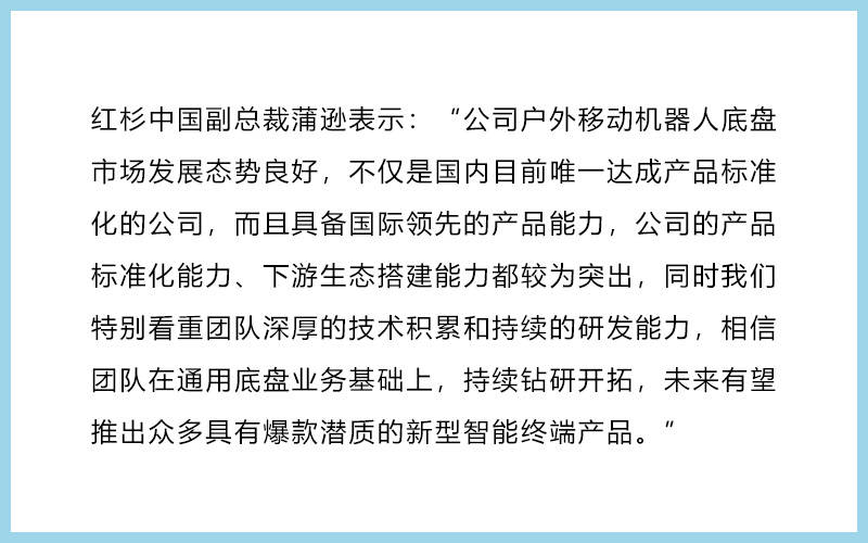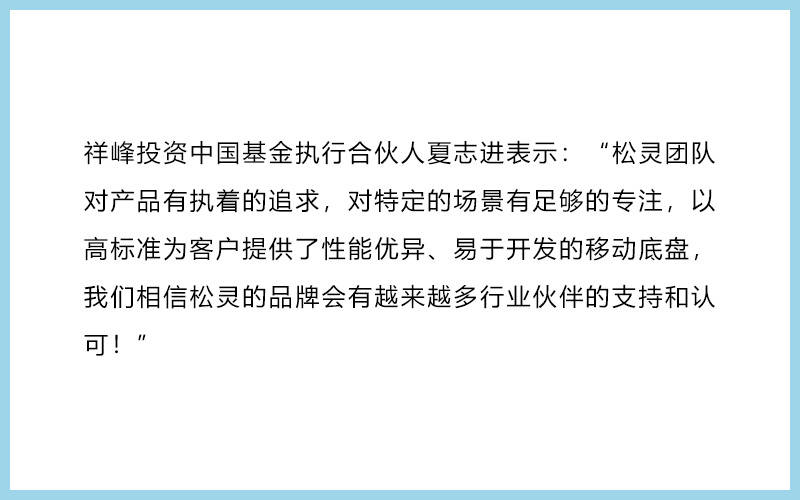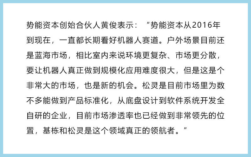 36氪获悉,2021年7月,户外场景的机器人方案商松灵机器人完成了亿元级A轮融资,投资方为红杉中国、五源资本、祥峰投资中国基金和HKX,均为一线投资机构。本轮资金,将用于研发功能更强大的自主导航低速无人驾驶系统,结合高性能移动底盘矩阵,深化户外全行业应用解决方案的部署。