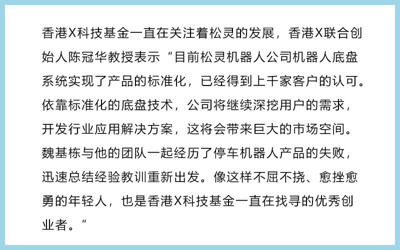 松灵机器人成立于2016年,公司创始团队和研发团队来自大疆和Mathworks等领军企业和全国知名科研院校机构,由香港科技大学李泽湘教授孵化并给予厚望。