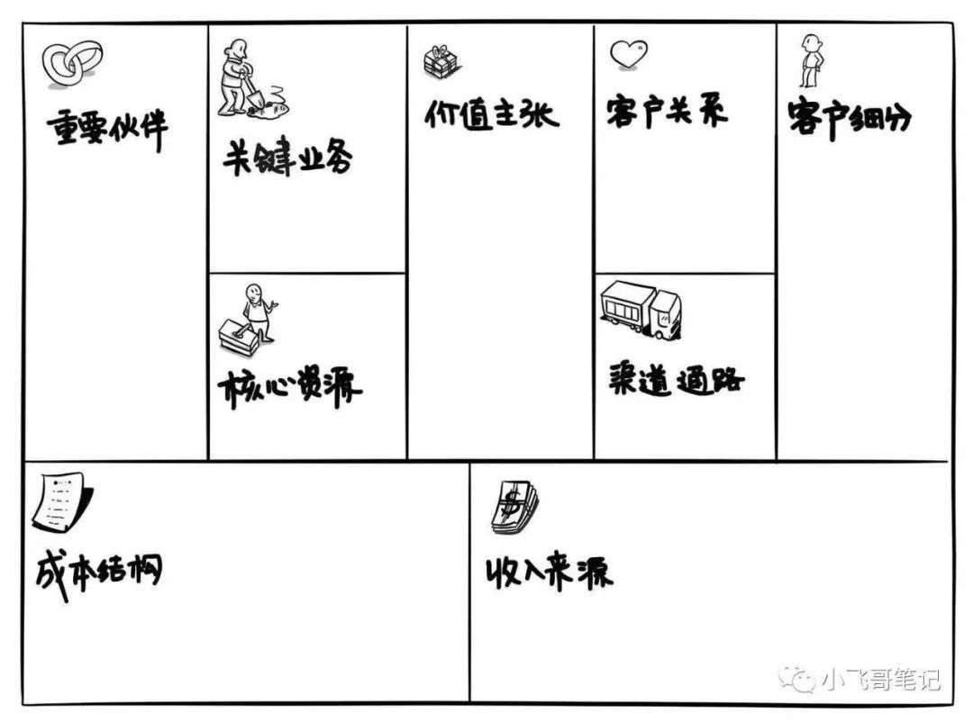 比如,《商业模式新生代》作者,亚历山大.奥斯特瓦特,提出来一套叫“商业模式画布的工具”,把设计和表达商业模式,变得简单、高效,如下图: