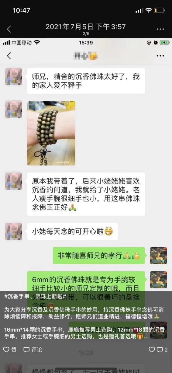 我朋友圈有个专门卖礼佛器具的微商,在他们的店铺里,香囊、烛灯、手串都是热销的事物,这些单价都在几十块以上。而在寺庙开过光的,溢价能到上百块,大师开过光的更是能到上千元。