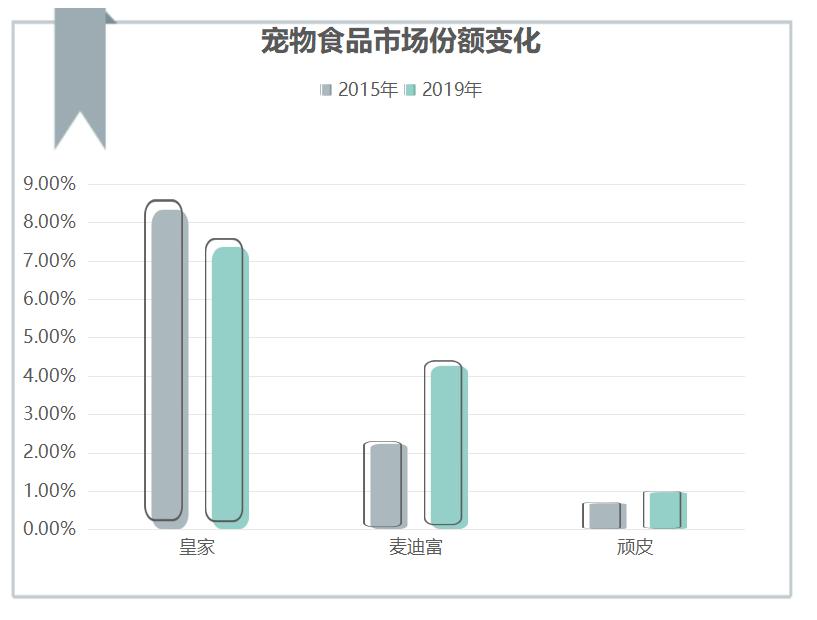 但我们应看到,随着国内宠物食品产业的快速发展,国内宠物食品企业的市场份额在稳步提高,国外企业的市场份额在逐渐下降。以皇家、麦富迪、顽皮为例,2015-2019年,皇家品牌在淘宝渠道中的份额由8.60%下降至7.60%,麦富迪的份额由2.30%提升至4.40%,中宠股份的份额由0.70%提升至1.00%