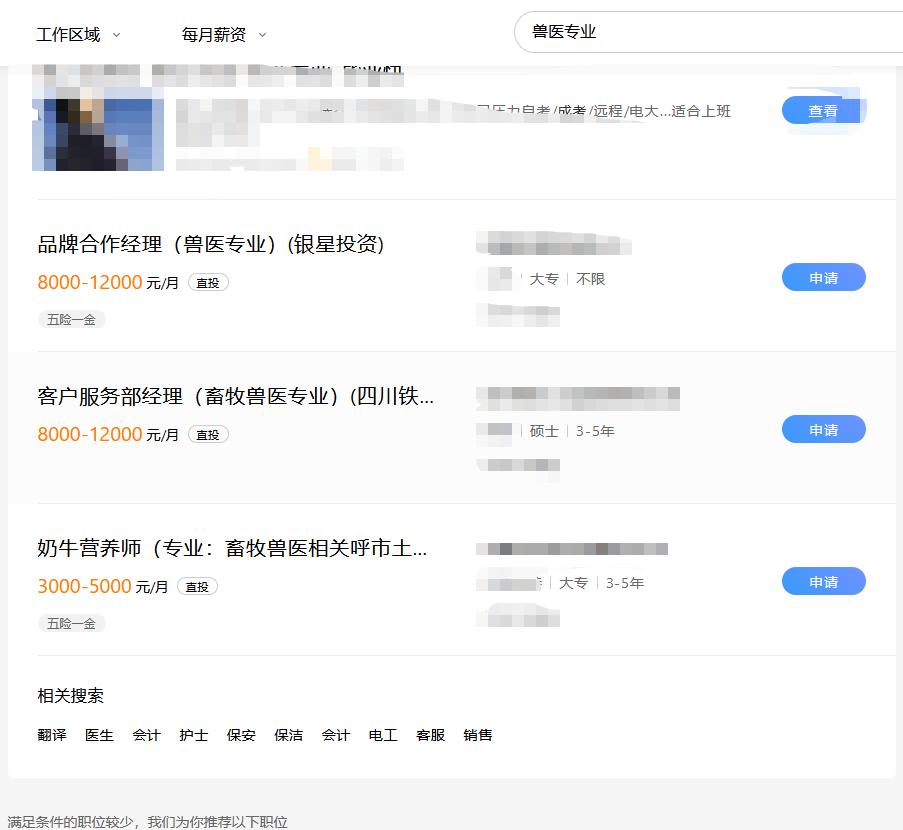 可能局长这么讲还不够透彻,局长继续在百度求职上以兽医为关键词随意搜索,发现大量招聘信息学历这一栏标注为小学或不限,超过20条招聘信息之后几乎已经没有兽医相关的岗位了,而是生物公司电话客服的招聘启事。