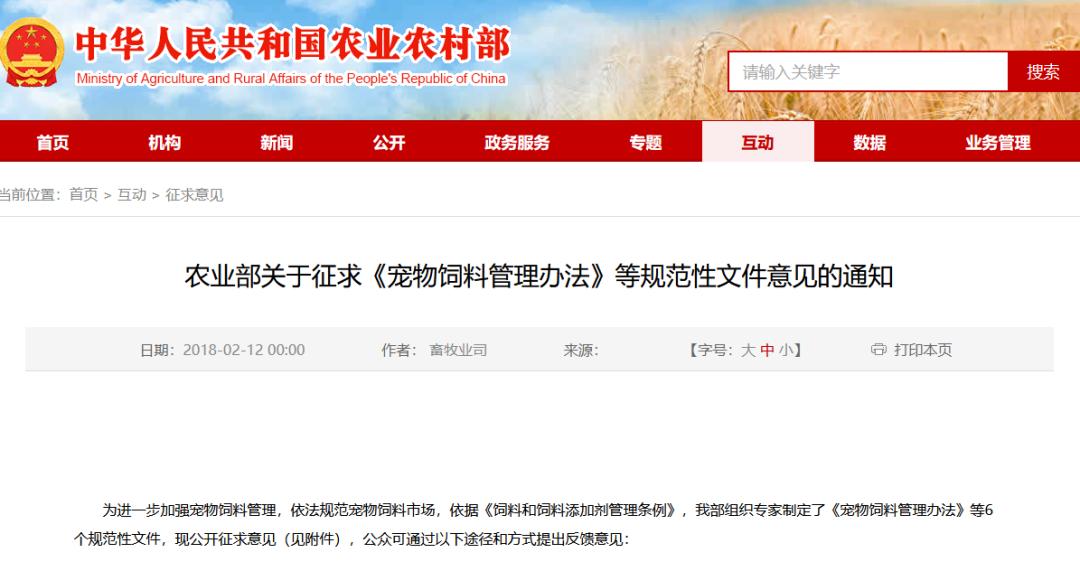 2018年4月农业农村部发布了第20号公告,出台了以《宠物饲料管理办法》为代表的一系列规范性文件。