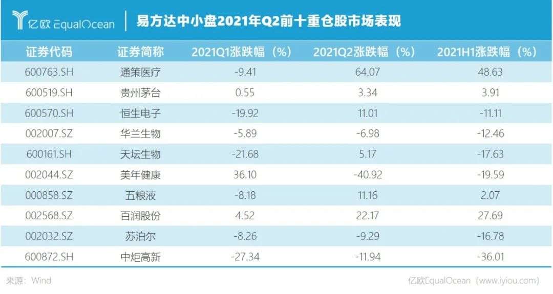 易方达中小盘前十大重仓股虽然没有新进或退出,但整体上对头部白酒股进行了减持,增持了医药股。