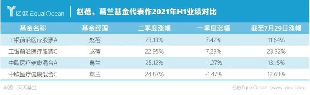 工银前沿医疗股票(A&C)在一二季度表现不凡,虽然二季度涨幅略低于葛兰的中欧医疗健康混合,但在一季度中欧医疗健康混合基金负收益的情况下,赵蓓的主题基金取得了超过7%的涨幅。