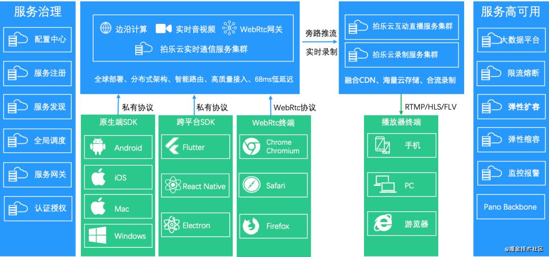 架构图的左边主要是服务的注册、认证、配置、发现、调度。右边主要是大数据分析平台,服务健康状况监控报警,服务资源弹性伸缩。中间是拍乐云的产品服务:语音通话、视频通话、互动白板、互动直播,云端录制等。