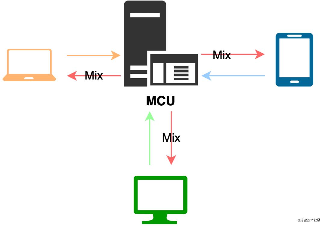 MCU(Multipoint Conferencing Unit)方案出现得比较早,相应的技术也非常成熟,该方案由一个服务器和多个客户端组成一个星形结构,各个端都将音视频数据发送给服务端,服务端会把所有客户端的音视频数据经过解码,同步,重采样,布局,混流,编码等,最后把媒体数据推送给所有的客户端。实际上服务器端就是一个音视频混合器,这种方案服务器的计算压力会非常大。一般情况下,在音频数据混流之前,服务端会把目标用户自己的音频数据移除,避免客户端听到自己的回声。在视频数据混流前,服务端可能检测每个目标用户是否有自定义的布局,否则就按系统默认的布局混流编码。在一些网络比较复杂的环境下,MCU 也可以按目标用户的带宽对视频数据的编码码率做一些自适应的调整。