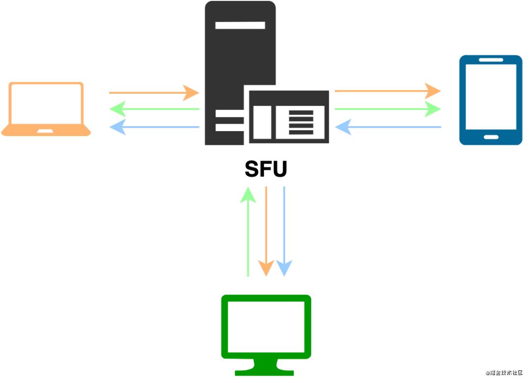 SFU(Selective Forwarding Unit)是最近几年流行的新架构,SFU 的方案跟 MCU 类似,每个客户端都把音视频数据发给服务端,然后由服务端转发给不同的客户端。跟 MCU 不同的地方,SFU 不对音视频进行混流,收到某个客户端的音视频数据后,按需(目标客户端是否订阅)将音视频数据原封不动的转发给目标客户端。它实际上就是一个音视频路由转发器。在这种方案里,所有的混流都是在客户端做的,对服务端的计算要求大大降低。在一些复杂的网络环境,视频的数据源端会使用 Simulcast 或 SVC 发送多层不同分辨率的视频流数据,服务端根据目标客户端的不同网络带宽和网络状况转发最合适的分辨率给目标客户端,使每个客户端的体验达到最佳。