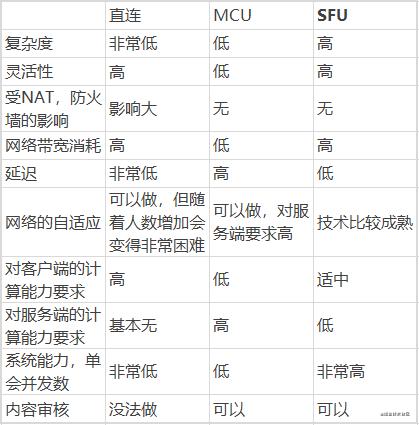 从上面的对比,我们可以看到,直连方案基本不大适合大会场景,而且无法对网络内容进行审核,直连方案目前市场上基本只有在免费场景中看到。而随着计算成本和带宽成本的大幅度下降,及超大并发的需求,SFU方案的优势变得非常明显,而MCU方案在一些企业内基于音视频终端的通讯等传统应用场景目前还是比较常见的。